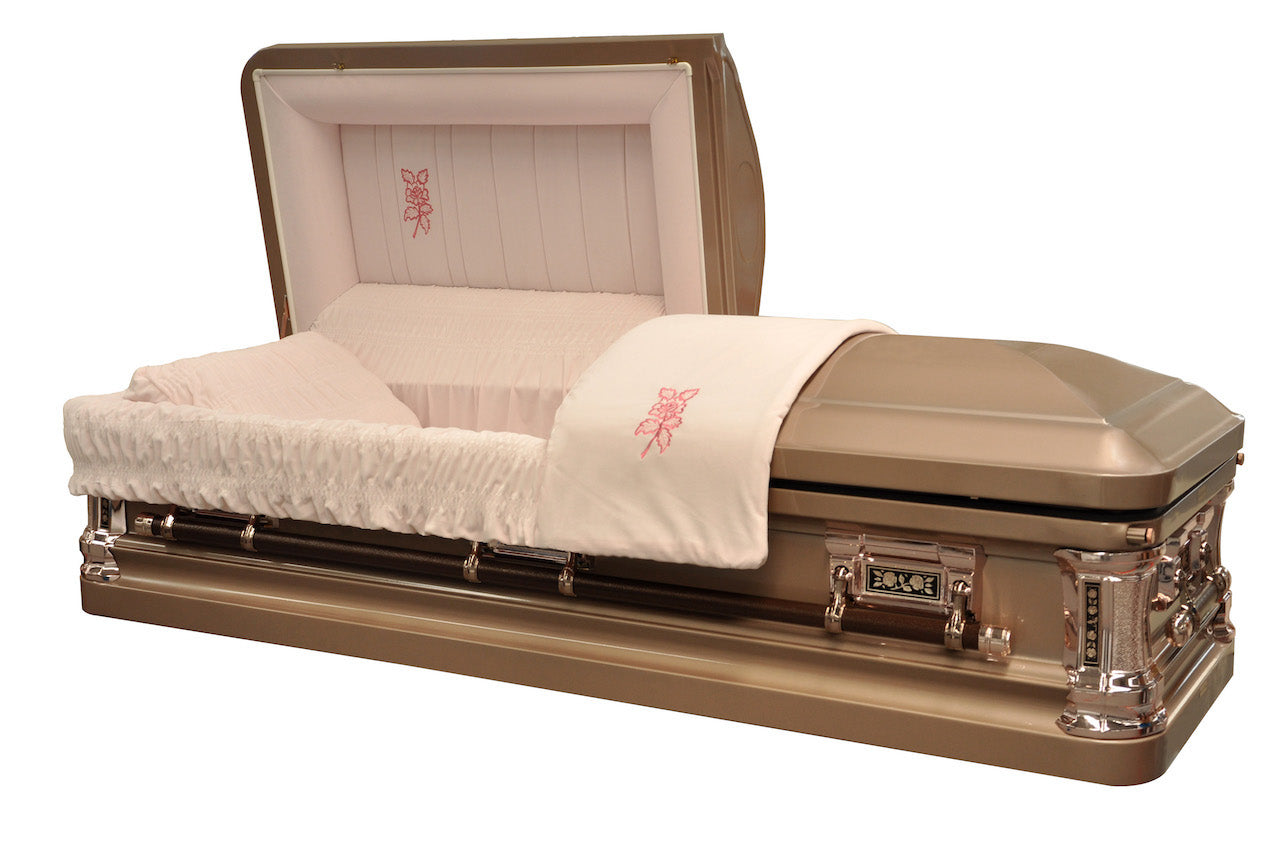 This metal funeral casket is made of 18 gauge gasketed in rose and silver shaded finish with pink velvet interior with outside width of 28.5" which is right size to fit into the vault in cemetery.